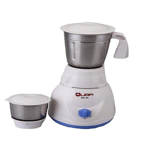 Product SKU:MG98 Size:20x10x12cm Color/finish:White and Blue Wattage:500W Material:ABS Plastic Capacity:1.5Ltr,1.25Ltr,400ml No of Jars:2 2 heavy Stainless Steel jars (with strong Lid).Big blender/shaker jar is 1.5L ,Chutney/Dry jar is 400ml. All jars have sharp Stainless Steel blades Jar Material: Stainless Steel + Juice Jar( Polycarbonate); Body Material: ABS Plastic; Cord Material: PVC with copper wire; Blade Material: Stainless Steel; Speed Control: 2 speed control Operating noise levels between 80-90 dB; Initial burning smell is to be expected due to evaporating varnish. Overload Protector helps motor to have Long Life even if the voltage is not accurate or at the time of short circuit The grinder features an overload protection switch that cuts off power supply to the appliance to prevent the motor from overheating. ABS body which is shock proof and have anti slip rubber feet which makes the use easy and enjoyable Everyday mixing and grinding in the kitchen becomes easier with QUBA mixer grinder that serves the best in grinding chutneys, spices and other preparatory ingredients. This mixer grinder has a powerful motor of 500W that makes it an efficient machine. Easy to use, this mixer grinder has smart features like pulse, overlad protection and speed regulation. This mixer grinder comes with two versatile SS jars fitted with super sharp blades to facilitate liquidizing, blending and grinding